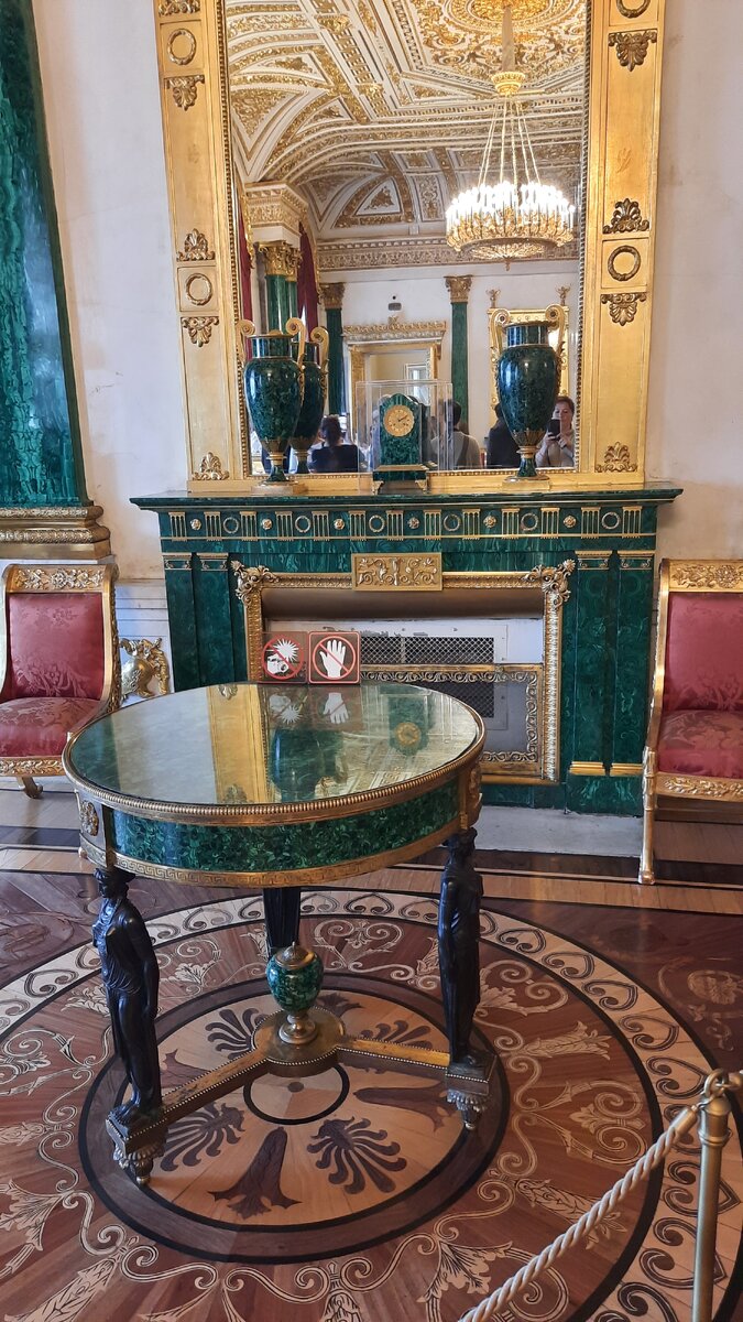 Малахитовая гостиная относилась к личным покоям жены Николая I Александры Фёдоровны и служила своеобразным «коридором», соединяющим её с парадными залами. Здесь императрице официально представляли дам, которые могли присутствовать на придворных балах. Именно про эту комнату писал Павел Бажов в «Хозяйке медной горы»: якобы колонны выполнены из цельного малахита. На самом же деле это техника русской мозаики: кусочки подгонялись по размеру, цвету и создавали эффект цельного камня. Кроме малахита, в убранстве комнаты особую роль играл красный шёлк и различные позолоченные элементы. При отделке интерьера мастера использовали декоративную технику «русская мозаика» — сложнейшую технологию, при которой поверхность оклеивали фрагментами цветного камня так, что в итоге создавалось впечатление монолитной плиты. Из малахита здесь также созданы вазы, камины и колонны с пилястрами. На полу гостиной уложен узорный паркет из девяти пород ценной древесины. Для отделки малахитовой гостиной использов