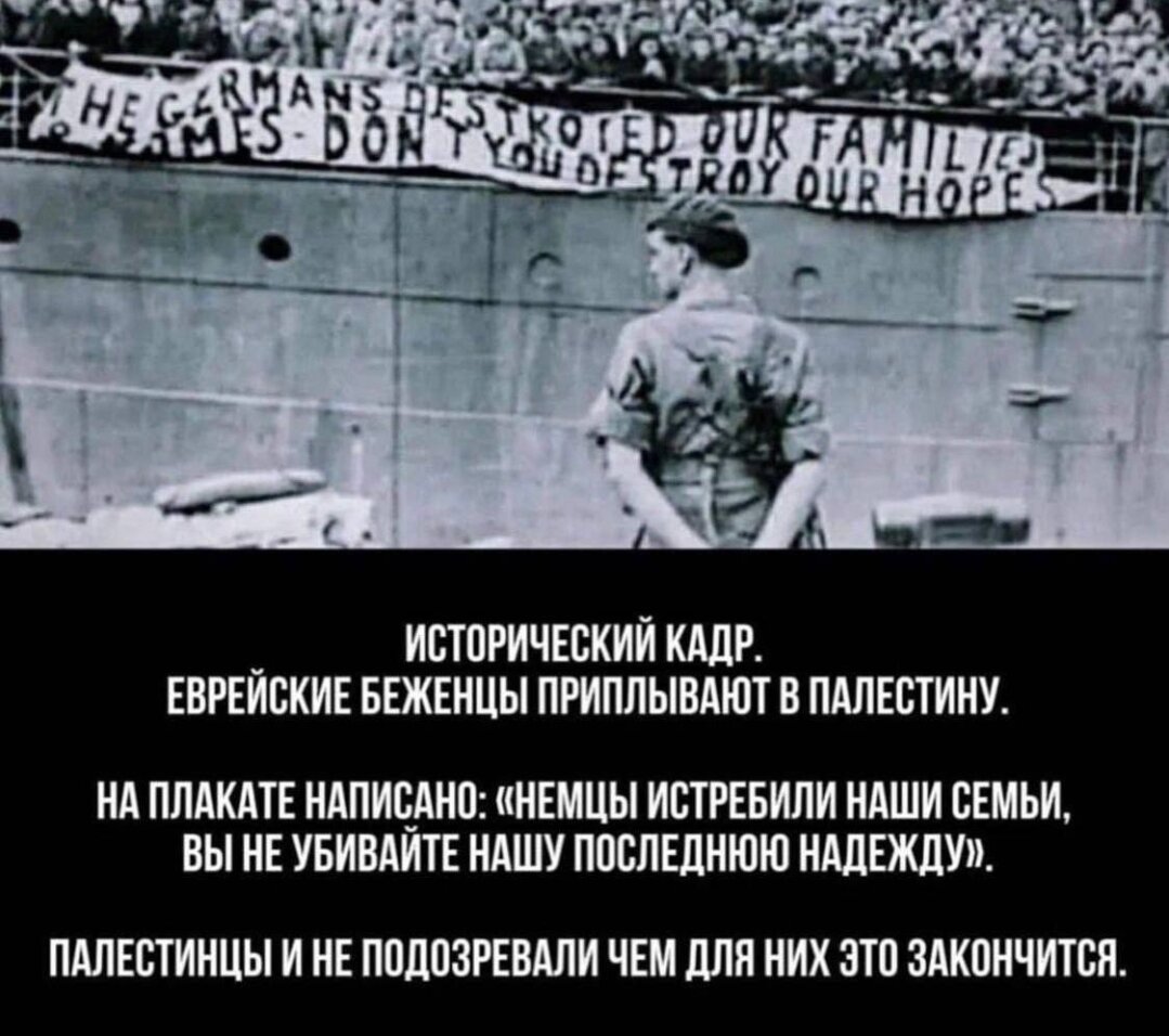 На этом фото запечатлено судно «Теодор Герцль» нелегально перевозившее еврейских беженцев в Палестину, которая в то время — 1947 год – находилась под управлением Великобритании в рамках мандата Лиги Наций. Из-за арабских восстаний власти ввели ограничение на еврейскую иммиграцию. Корабль был перехвачен британскими солдатами. В результате вооруженного столкновения десятки евреев на борту были ранены. Воззвание к состраданию на плакате направлено не к арабам, а к англичанам. Арабов никто не спрашивал.