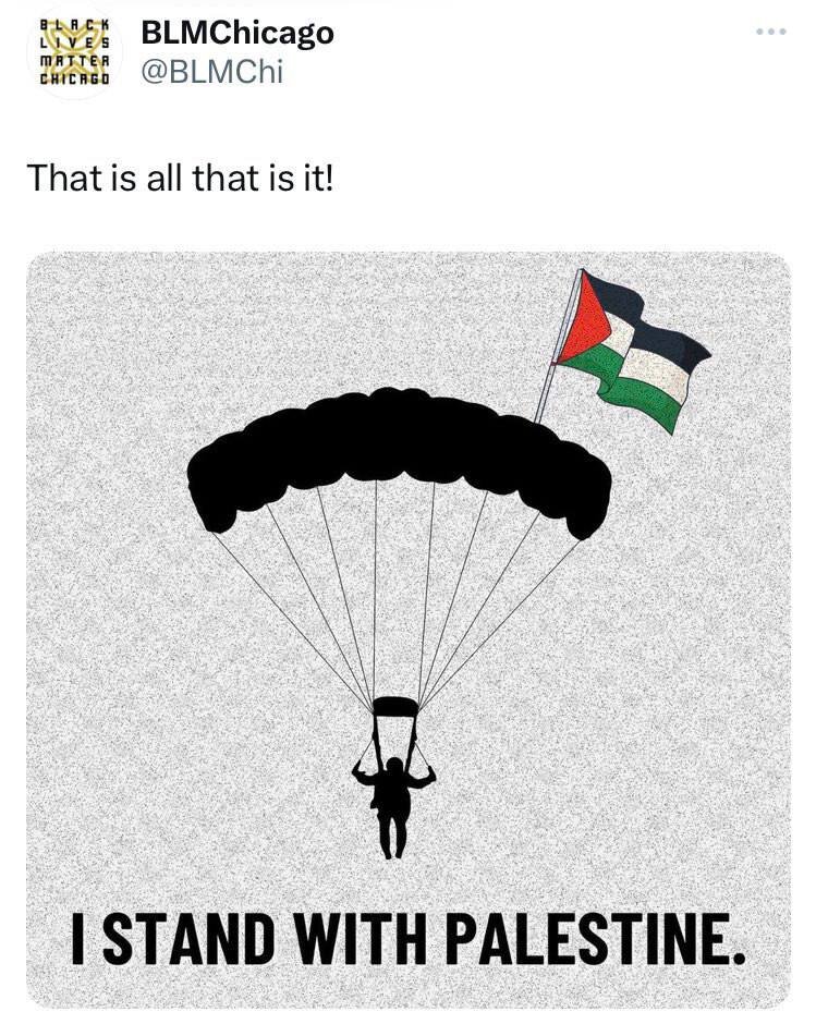 На официальной странице чикагского филиала движения в соцсети появилась знаковая картинка с надписью: "Мы за Палестину" и летящим на парашюте человекам с соответствующим флагом в руках. Собственно, движение "темнокожих братьев" никогда и не скрывало своего сочувствия арабским соплеменникам. «Black Lives Matter солидарны с палестинцами. Мы — движение, посвященное прекращению колониализма поселенцев во всех его формах, и будем продолжать выступать за освобождение Палестины. (Всегда были. И всегда будем). #свободуПалестине», — писала группа BLM в Twitter еще в 2021 году и с тех пор официально свою позицию не меняла.