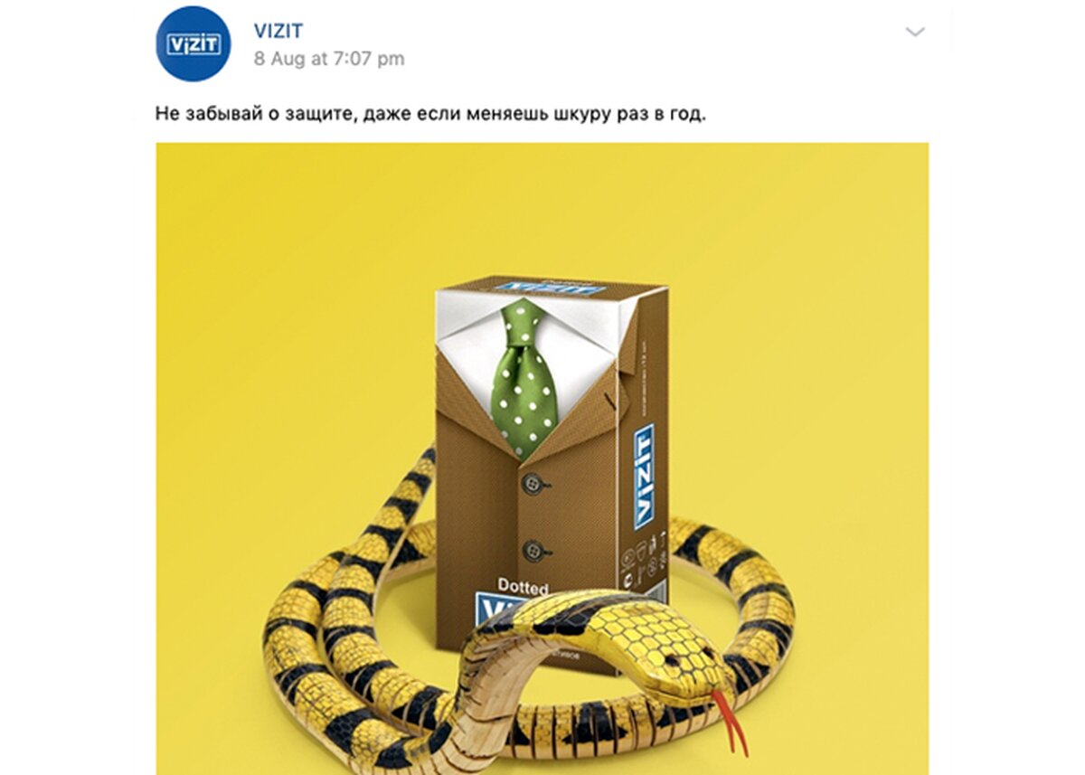 Скандальная реклама - отдельное направление маркетинга. Порой креативность создателей вместо одобрения потребителей вызывает скорее смешанные чувства. Кто-то находит в такой рекламе личное оскорбление и унижение достоинства. Именно этого и хотят рекламщики, чтобы их творение вызывало споры и интерес. Так работает черный пиар. Рассказываем о самых скандальных рекламных кампаниях: Visit Производитель презервативов никогда не отличался стеснительностью. В 2019 компания опубликовала пост, на котором была изображена пачка презервативов со змеей и подписью: «Не забывай о защите, даже если меняешь шкуру раз в год». На этот пост обратила внимание общественность: не понравилась реклама ни активистам, ни широкой публике. Компании пришлось писать длинный пост с извинениями, суть которого была примерно в том, что маркетологи не хотели оскорбить девушек, а говорили лишь про редкий секс. Однако это породило лишь новую волну негодования: пользователи спорили с брендом и между собой о том, что, вообще