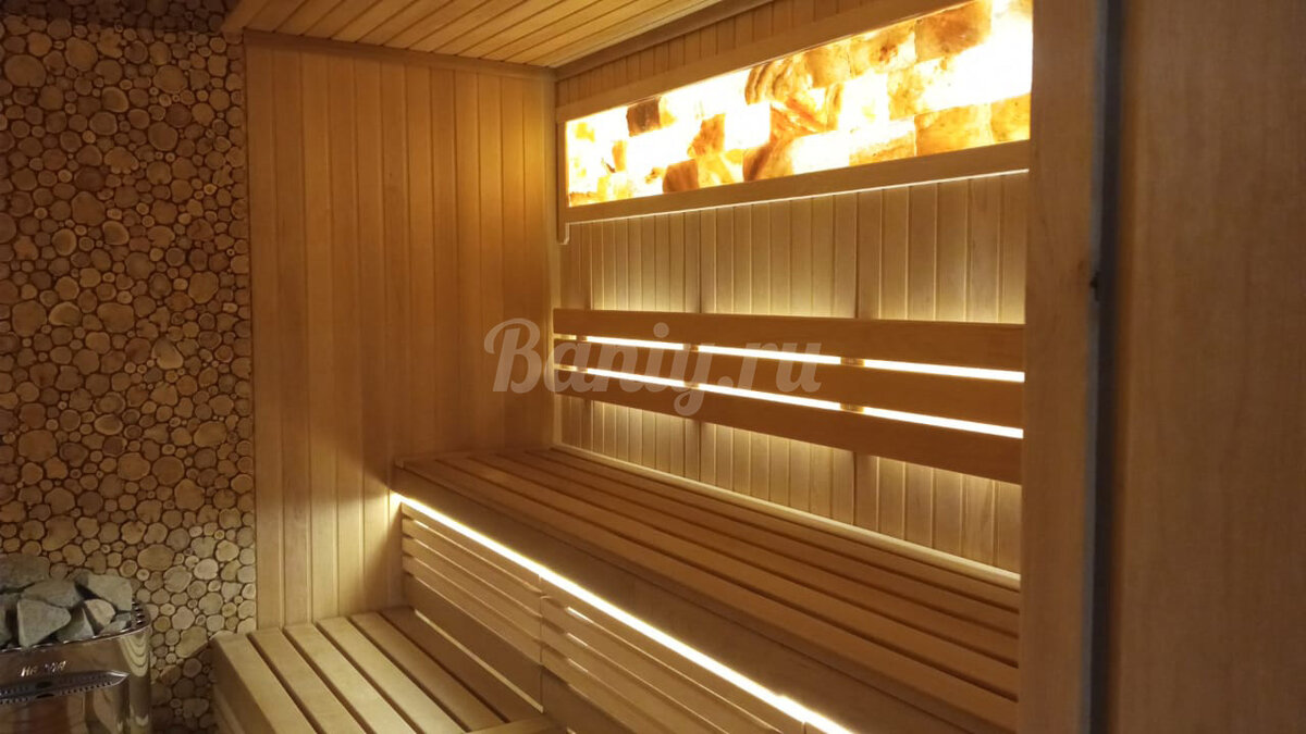 Месторасположение Тверская область, д. Конаково. Размеры сауны Ширина 4 м, глубина 4 м, высота 2,4 м. Отделка сауны Стены и потолок обшиты вагонкой из ольхи. Рабочая ширина вагонки – 90 мм, профиль – Софт лайн, категория - «Экстра». Полки – по двум стенам, полноценные, двух-ярусные. Ширина верхнего полка - 600 мм, ширина нижнего – 600 мм. Для изготовления полков применялась планка из термо-ольхи, шириной - 90 мм, толщиной - 26 мм. По стене изготовлена спинка: три широкие планки, шириной – 90 мм. На полу смонтированы съёмные деревянные трапики, изготовлены из ольхи. Печь Смонтирована электрическая печь фирмы «Harvia» (Финляндия). Модель называется Club Combi. В печь заложено 70 кг банного камня – жадеит. За печью смонтировано панно из можжевельника. По 2-м стенам смонтирована гималайская соль 100*200*50 мм со светодиодной подсветкой. Освещение За спинкой и по торцам полков установлена светодиодная лента напряжением 24 В. Дверь Смонтирована стеклянная дверь, стекло брон