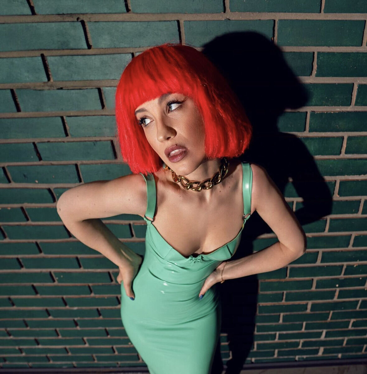 Виктория Дайнеко редко проводит эксперименты над своей внешностью. Однако ради работы она готова пойти на жертвы. Например, на днях певица опубликовала снимки с новой фотосессии, где предстала в необычном образе, в котором ее сложно узнать. Девушка предстала перед камерой в зеленом облегающем латексном платье с декольте длины до колена. На Виктории парик с короткими красными волосами и густой челкой. В качестве аксессуаров певица использует массивную золотую цепь и красные очки.
