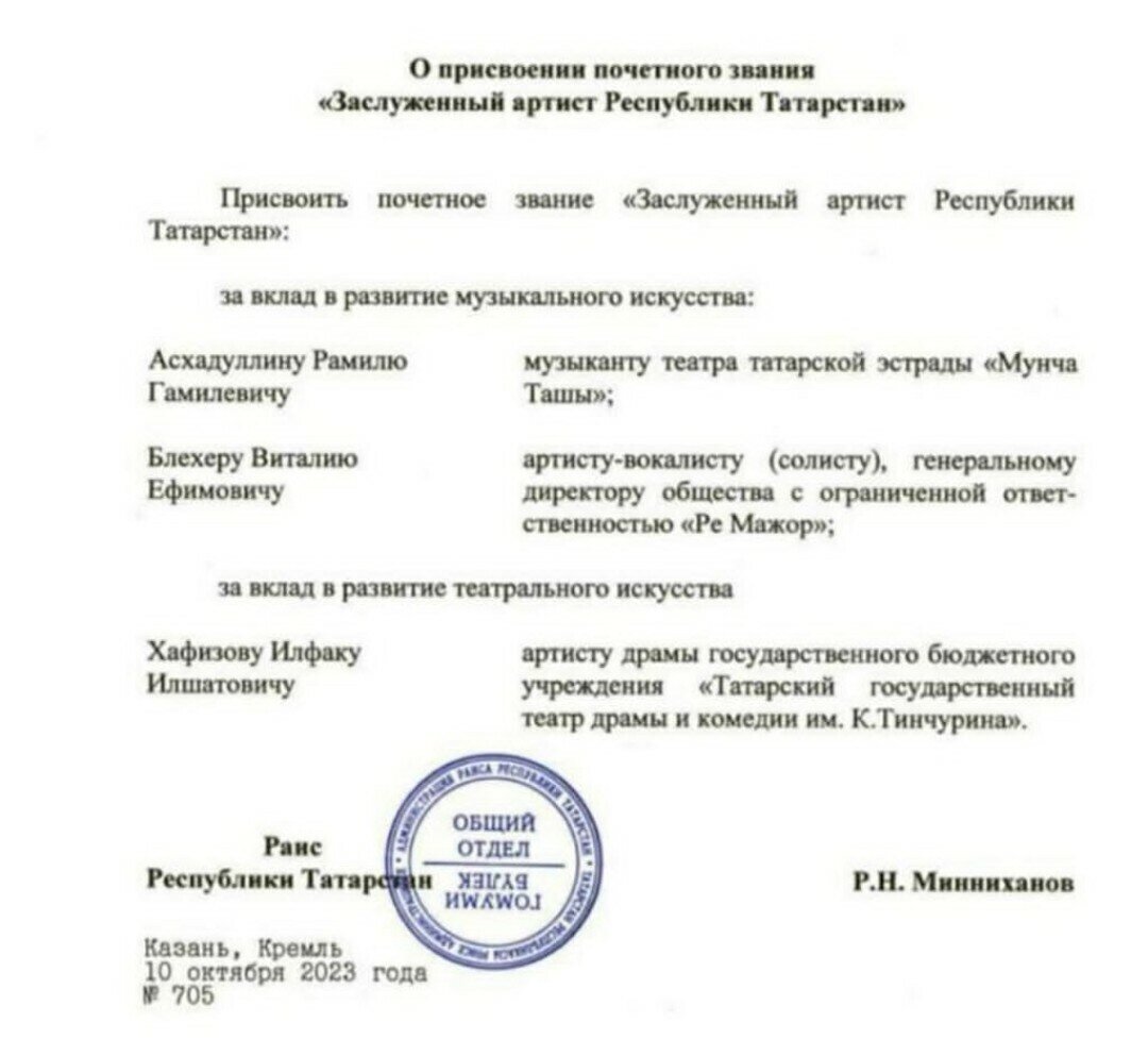 Җырчы Винарис Ильегеткә «Татарстанның атказанган артисты» исеме бирелгән. «Яраткан тамашачым, сезнең белән уртаклашасы килгән зур шатлыгым бар. Бүген, 11 октябрь көнне, минем әниемнең туган көнендә, шундый яхшы хәбәр килеп иреште. Кечкенәдән җырга гашыйк булып, уен коралларын яратып, гаҗәеп шәхесләр ярдәме белән артист дәрәҗәсенә җитешкән Винарис Ильегет – Виталий Ефим улы Блехер мин. Ә бүген исә мәдәният министры һәм хөрмәтле Рәисебез Рөстәм Нургали улы Миңнеханов карары буенча, миңа атказанган артист исемен бирделәр! Минем өчен бу – зур дәрәҗә. Тормышны яратып, җырлап яшәргә өйрәткән әти-әниемә, бөек шәхесләребезгә, кадерле кешеләремә, тамашачыларыма, дусларыма, Лилиямә чиксез рәхмәтлемен! Бу яхшы яңалык әниемнең туган көне җиткәндә булуы – икеләтә бәхет! Иҗатыма югары бәя бирүегезгә рәхмәт, татар халкым!» – дип яза үзенең сәхифәсендә Винарис. Шулай ук әлеге мактаулы исемгә Кәрим Тинчурин театры артисты Илфак Хафизов һәм «Мунча ташы» татар эстрадасы театры артисты Рамил Әсхәдуллиннар