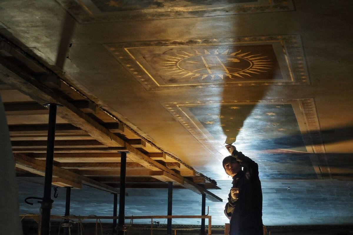 «Сделано усиление перекрытий, проведены мероприятия от прогрессирующего воздействия — внедрение сорокового швеллера, на него сделано опирание балок перекрытия, — рассказывает заместитель руководителя проекта Антон Павлов. — При обследовании была выявлена стадия разрушения, местами не было перекрытия совсем. В главном зале мероприятия выполнены, по документации выставлены леса, мы подпираем потолок, мероприятия по его усилению процентов на 80 уже выполнены, и частично, где это разрешено, начинаем делать реставрацию — процентов на 40 она сделана».