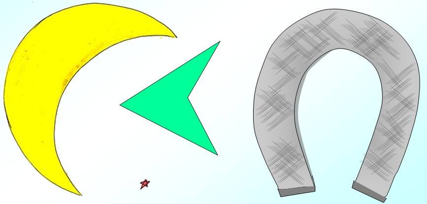 1_Лунный серп, невыпуклый четырёхугольник и подкова. Фигуры требуется разбить на 6 частей, проведя всего 2 прямые. Как это сделать?