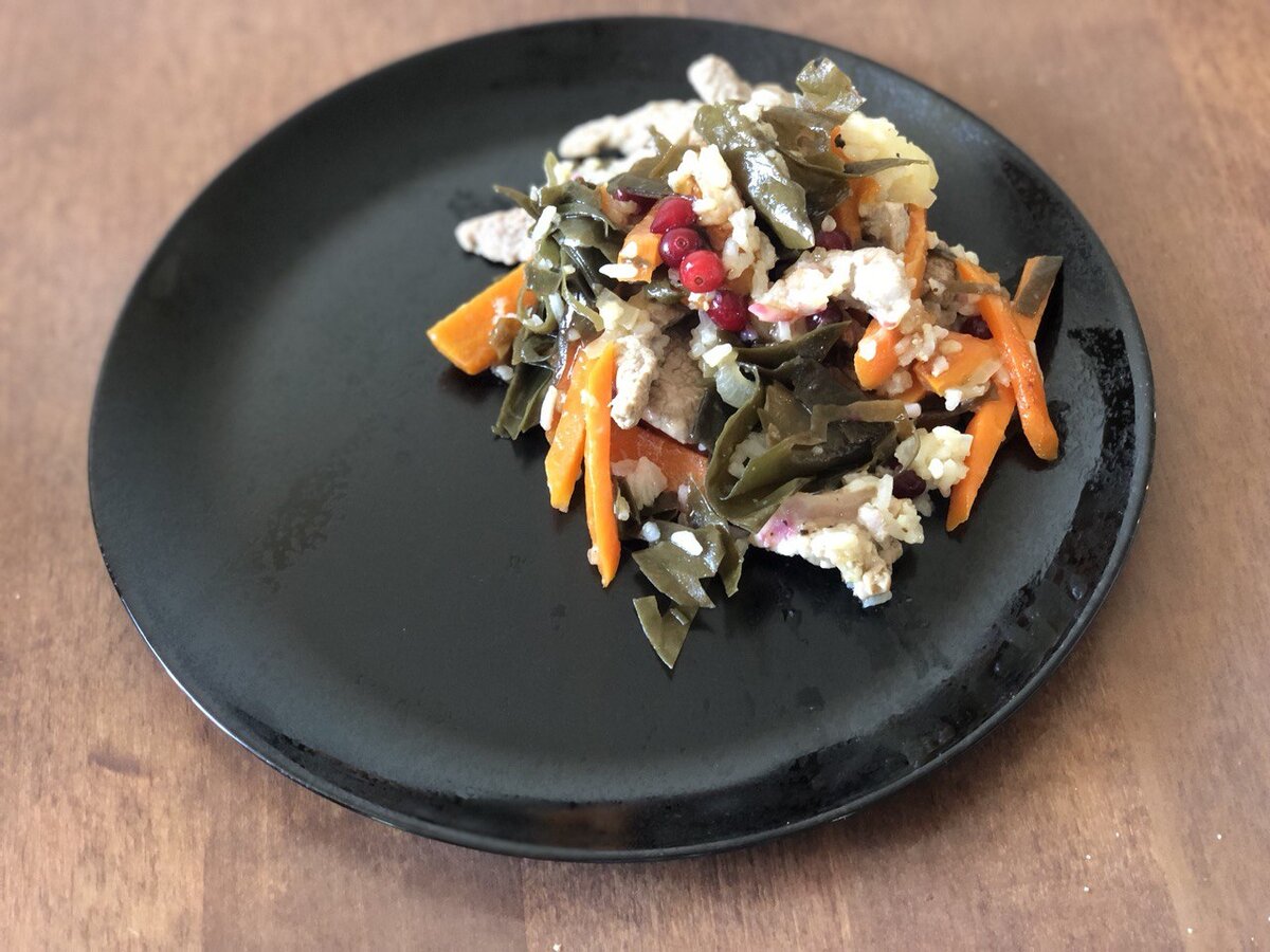 У меня в морозилке живет пакет с клюквой замороженной, а в шкафчике сушеная морская капуста. Рекомендую всем! Это очень удобно - одна минута и готовится и то и другое в съедобный вид, создающий шедевральные вкусы. Лук и морковь тоже дома всегда есть. У меня были остатки сырой врезки свиной, остатки риса приготовленного и немного соуса Терияки. Время готовки - пять, семь минут 1. Залил водой и прокипятил горсть морской капусты. 2. Нарезал мелкой соломкой свинину, морковь и лук 3. На подсолнечном рафинированном масле обжарил до готовности вместе с солью и перцем мясо с морковью и луком. 4. Высыпал туда готовый рис, слитую морскую капусту, горсть замороженной клюквы и Терияки. 5. Перемешал, выключил, накрыл крышкой постоять пять минут, пока все пропитается и клюква разморозится. Готово! Блюдо сразу сбалансировано по правилу здоровой тарелки, можете у Татьяны, нутрициолога, на канале проверить. Кислая клюква со сладким соусом, солено-острой свининой и овощами восхитительно сливается с х
