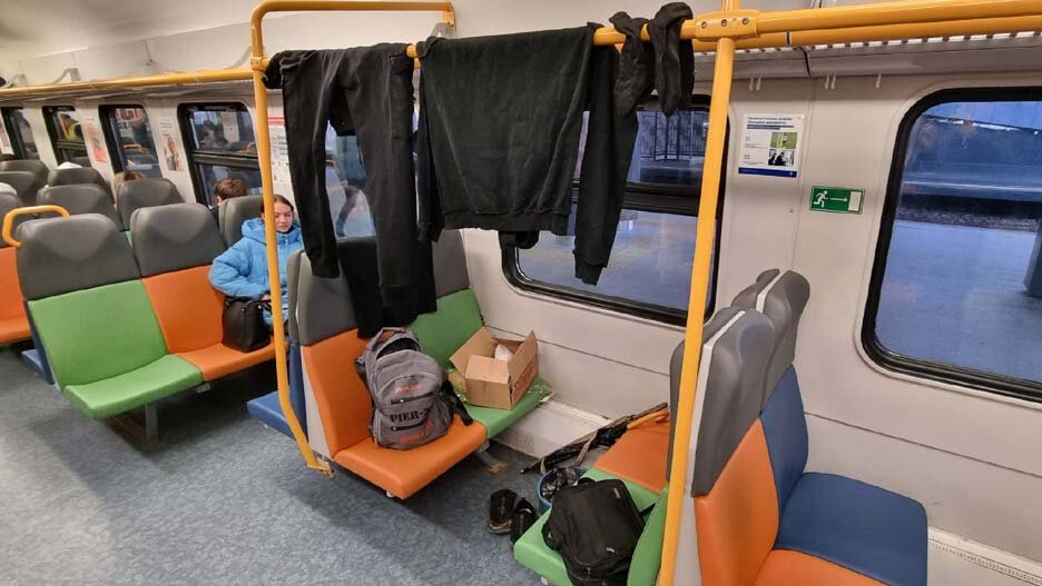 Развешанная на поручнях одежда и снятая обувь встретила сегодня пассажиров 3-го вагона поезда МЦД отправлением в 7:22. «Охрану звать бесполезно, — написал в редакцию „Зеленоград.ру“ Алексей Ч. — так как, по всей видимости, это и есть вещи охраны». Другие пассажиры подтверждают, что это вещи охраны. «Они работают вахтой на составе… едят там, и спят, и в туалет ходят… может видели в Иволгах баклажки 5-литровые около туалета на полках — это охрана закупаются на смену». О проблемах с МЦД сообщайте по телефонам горячих линий: ЧИТАЙТЕ ТАКЖЕ