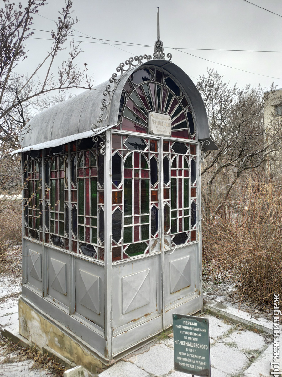 На территории музея-усадьбы Чернышевского находится довольно интересный объект. Это первый памятник на могиле писателя, установленный на Воскресенском кладбище, а точнее часовня над фамильным склепом. Часовня была изготовлена по проекту художника-архитектора Фёдора Густавовича Беренштама, мужа В.А.Пыпиной. Деньги на неё собирали почти год, после чего изготовили, доставили в разобранном виде в Саратов и 12 дней устанавливали. В 1946-м году эта старая часовня была установлена на территории музея-усадьбы. Потому что 30 октября 1939 года к 50-летию со дня смерти писателя на Воскресенском кладбище установили обелиск с памятником работы скульптора П.Ф. Дундука и архитектора М.В. Крестина. В 1960-е и этот мемориал был обновлён. Рассмотрим старую часовню. Мраморная табличка. На дореволюционных фотографиях здесь была чёрная табличка (см.выше). Кроме витражей имеется ещё и металлический декор. Внутри. Ольга Сократовна писала, что часовня получилась настолько красивой, что "все ходят нарочно любо