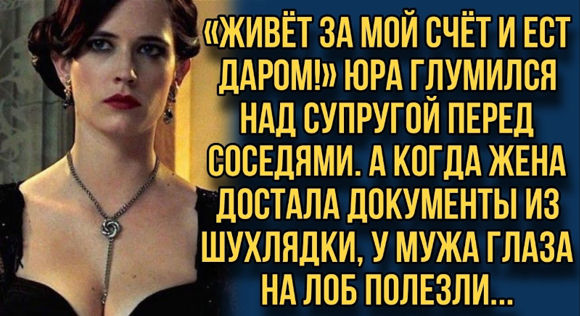 А жена, спокойно не оборачиваясь к мужу, ответила. "Это средство. С бабушкиного счета." Юра хихикнул, объяснил друзьям, что же наличие крыши поехала, бабуля то уже давно сказала, что бабушка ей наследство, как правило. "А 30 тысяч, может даже на еду не хватает!" не сидел бы он сейчас за столом, не ел бы. "Салям, я запеченную рыбку питался бы макаронами!" и одежду себе покупать. "Мне на рынке жена объяснила, что она все надеялась, что муж изменится, почувствуешь себя хозяином, насладишься властью, а потом человеком станешь," грустно улыбнулась Аня. "Но зря надеялась, мужей не поверил." "А что ж ты прабабушку не рассказывал-то?" "Врешь, да так. Тебе же расскажи, ты тут же все до халявы дорвешься и все спустишь. А я хотел, чтобы ты сам человеком стал," сказала Аня и ушла.