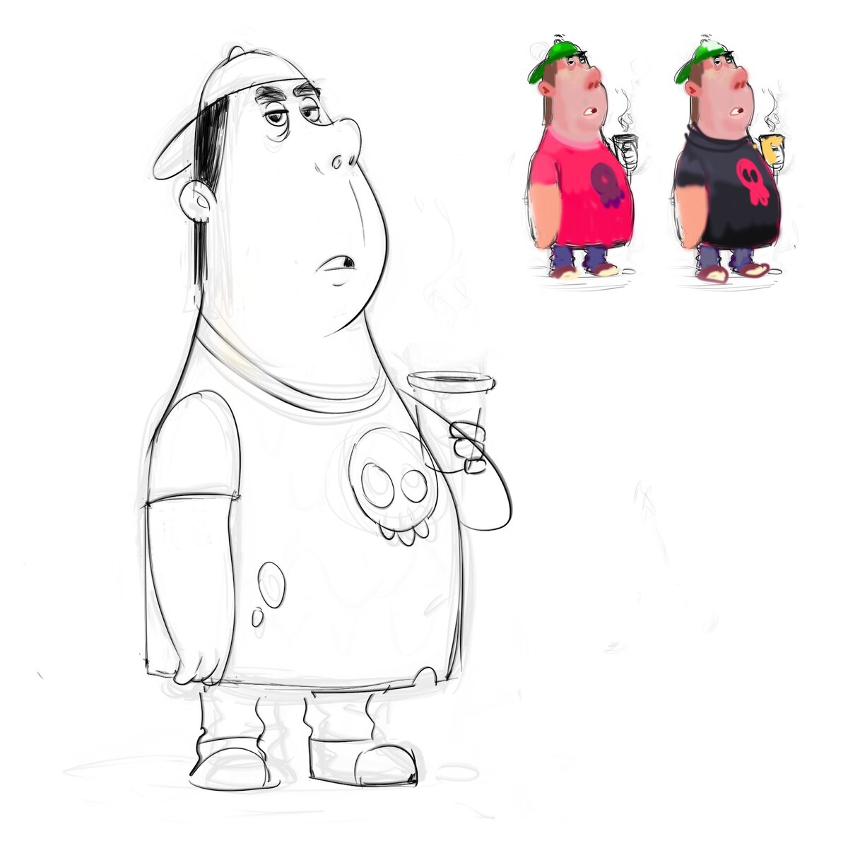 Я набросала скетч персонажа и слева очень сыро прикинула миниатюру с цветом. У меня не было четкой задумки, здесь я скорее просто наслаждалась процессом.