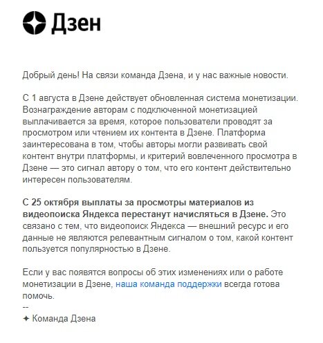 Появилась более расширенная информация об анонсированном 11 октября предстоящем отключении оплаты от Яндекс видеопоиска. Но начать хочу с анекдота, хоть и плохой я рассказчик. Скорей вольный пересказ, как папа-банкир объяснял сыну принцип своей работы. "" Взял папа в руки кусок сала и отдал этот же кусок. - В чем же смысл, папа - спрашивает сын - ты же отдал сало обратно. - А пальчики то жирные - ухмыльнулся папа "" Итак, вчера сообщили нам что выплаты скоро обрежут, от слова совсем Но смутила меня формулировка. Дело в том, что Яндекс платит за просмотры В собственном проигрывателе, а просмотры из видеопоиска, может означать и переходы в видео используя видеопоиск. Посему задал я вопрос в ТП И получил ответ, который меня несколько успокоил То есть за переход при помощи поиска и просмотр в самом Дзен что-то могут и начислить. Но, мы же все люди взрослые, понимаем что Яндекс то платить не перестанет. Вот я и спросил а куда денутся начисленные деньги. Таким образом мы и получаем ситуацию