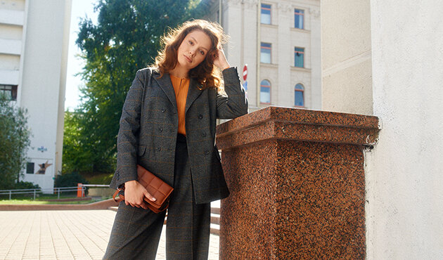 Главный тренд последних сезонов – оверсайз, который подходит для тех, кто хочет чувствовать себя свободно и комфортно. Если с брюками такой вариант не пройдёт, то жакет вполне может быть на размер больше.