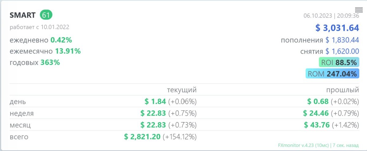 💰 +2821$(+285000р) или +154.1% к депозиту на полном пассиве принес робот Smart за 1 год 8 месяцев Такой интересный кейс партнера. Причем тело депозита выведено, робот работает только на % и это значит что риски у партнера уже нулевые. Вот такие цифры получаются на дистанции, по стратегии с минимальными рисками.