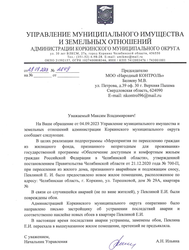 Публикуем ранее поступивший ответ по обращению жителей г. Коркино Челябинской области по поводу потопа в доме на ул. Терешковой 29А. (https://nkregion.ru/news/ljudi-poluchili-kljuchi-i-pridja-v-novyj-dom-uvideli-potop/).