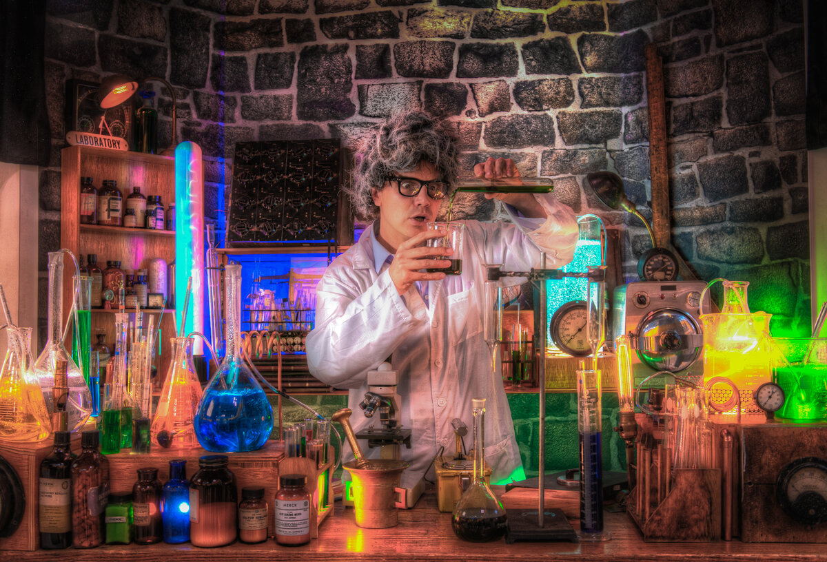 Через пять минут кухня начала трансформироваться в серьезную лабораторию. Трубки, бочки, манометры, колбы, термометры, фантастических видов перегонные кубы — все это доставалось из шкафов, вкручивалось, вставлялось, соединялось и сплеталось между собой.