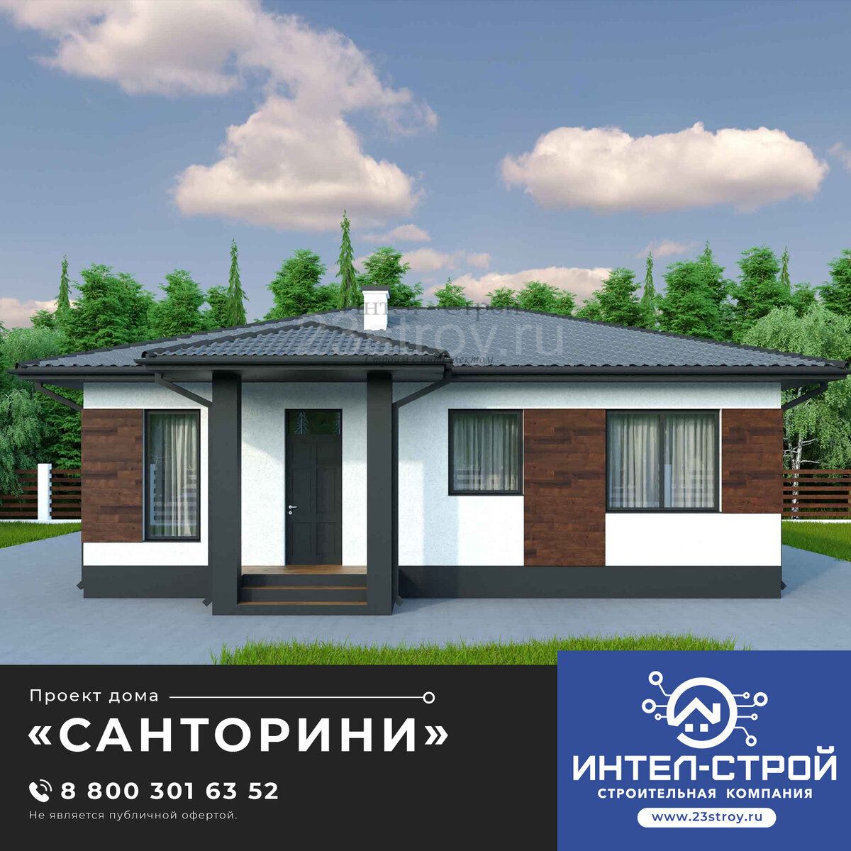 Дом, при своих небольших размерах, имеет комфортную планировку для проживания семьи с двумя детьми. Три изолированных спальни объединяет центральное пространство гостиной-столовой, к которой примыкает и зона кухни. Из гостиной есть выход на придомовую террасу. Все технические и хозяйственные помещения в дома размещены в левом крыле дома, отдельно от жилой зоны: ванная комната, санузел с душевой и топочная.