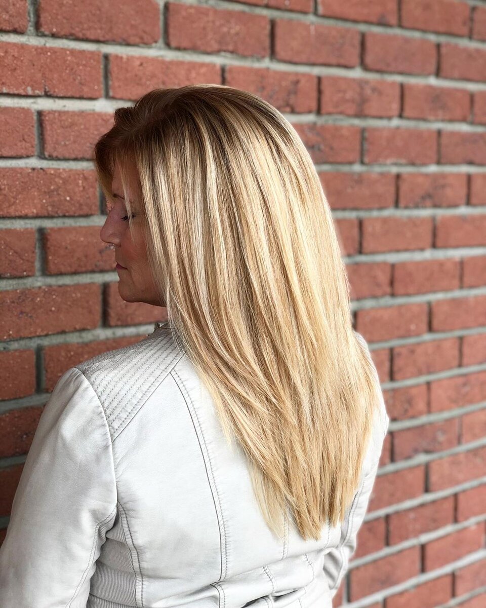 Один из лучших цветов волос для женщин старше 50 - это яркий блонд с темными корнями. Этот цвет может скрасить ваш образ на годы. Балаяж для светлых волос помогает длинным, уложенным слоями волосам придать объем и дополнительную текстуру.