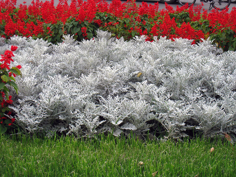 Многолетнее декоративно-лиственное растение, которое используется для обрамления цветущих видов цинерарии. Второе название – крестовник приморский. Листья этого представителя флоры имеют зеленовато-пепельную окраску. Зеленые листовые пластины сегментированы и покрыты серебристыми ворсинками. Именно необычный внешний вид делает цинерарию приморскую идеальным фоном для цветущих растений в ландшафтном дизайне. Кружевные ветви могут использоваться в букетной флористике.