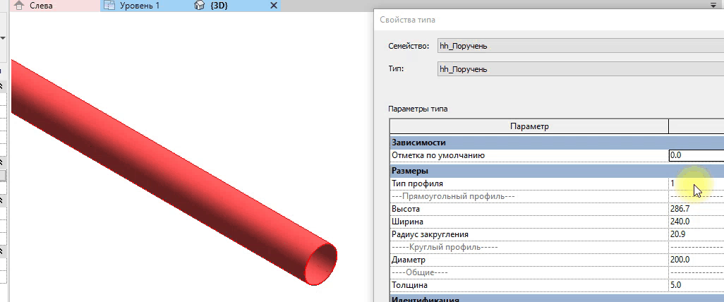 Задача: В семействе ограждения должна быть возможность переключать профиль перил с прямоугольного на круглые. Делаем поручень в категории обобщенная модель на основе шаблона для типовой одели. Задаем опорные плоскости и параметр длина: И переходим на фасад «Слева». Задаем плоскости и параметры для прямоугольного сечения. Инструментом выдавливания создаем элемент. Получаем элемент: Делаем так же элемент круглого профиля: Свойства разделим по профилям: Теперь сделаем переключение по типу: