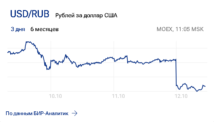 Наиболее низкие значения курсов валют были зафиксированы в первые минуты торгов. Доллар опустился до 96,46 рубля, юань достиг минимума с 27 сентября — 13,2 рубля, а евро упал до 102,59 рубля, что является минимумом с 29 сентября.