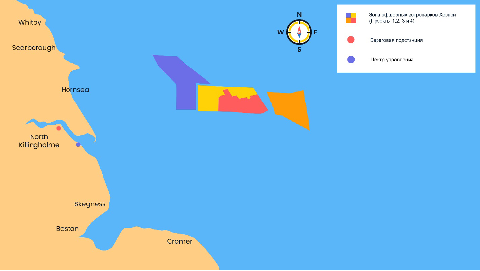 История развития оффшорной ветроэнергетики в Европе. Пять самых значимых проектов. Проект 5. Зона оффшорных ветропарков ХорнСи (HornSea), 2022 год Зона застройки Хорнси (Hornsea) была удостоена премии Краун Истейт (Crown Estate) в 2010 году. Общая мощность зоны составила 4 ГВт, и она разрабатывается в виде 4 отдельных проектов Хорнси (Hornsea 1, 2, 3 и 4!), которые завершены лишь частично. Хорнси 1 (Hornsea 1) мощностью 1,2 гигаватта (ГВт) стала первой в мире морской ветроэлектростанцией, мощность которой превысила 1 ГВт. Хорнси 2 (Hornsea 2) полностью вступила в строй в 2022 году и в настоящее время является крупнейшей в мире установленной ветроэлектростанцией мощностью 1,3 ГВт (но надолго ли?). Ожидается, что строительство Хорнси 3 (Hornsea 3) начнется в 2023 году, и его планируемая мощность составит 2,4 ГВт. Хорнси 4 (Hornsea 4) все еще находится в разработке. Когда проекты становятся такими масштабными, они, как правило, разрабатываются последовательно, чтобы в них использовались о