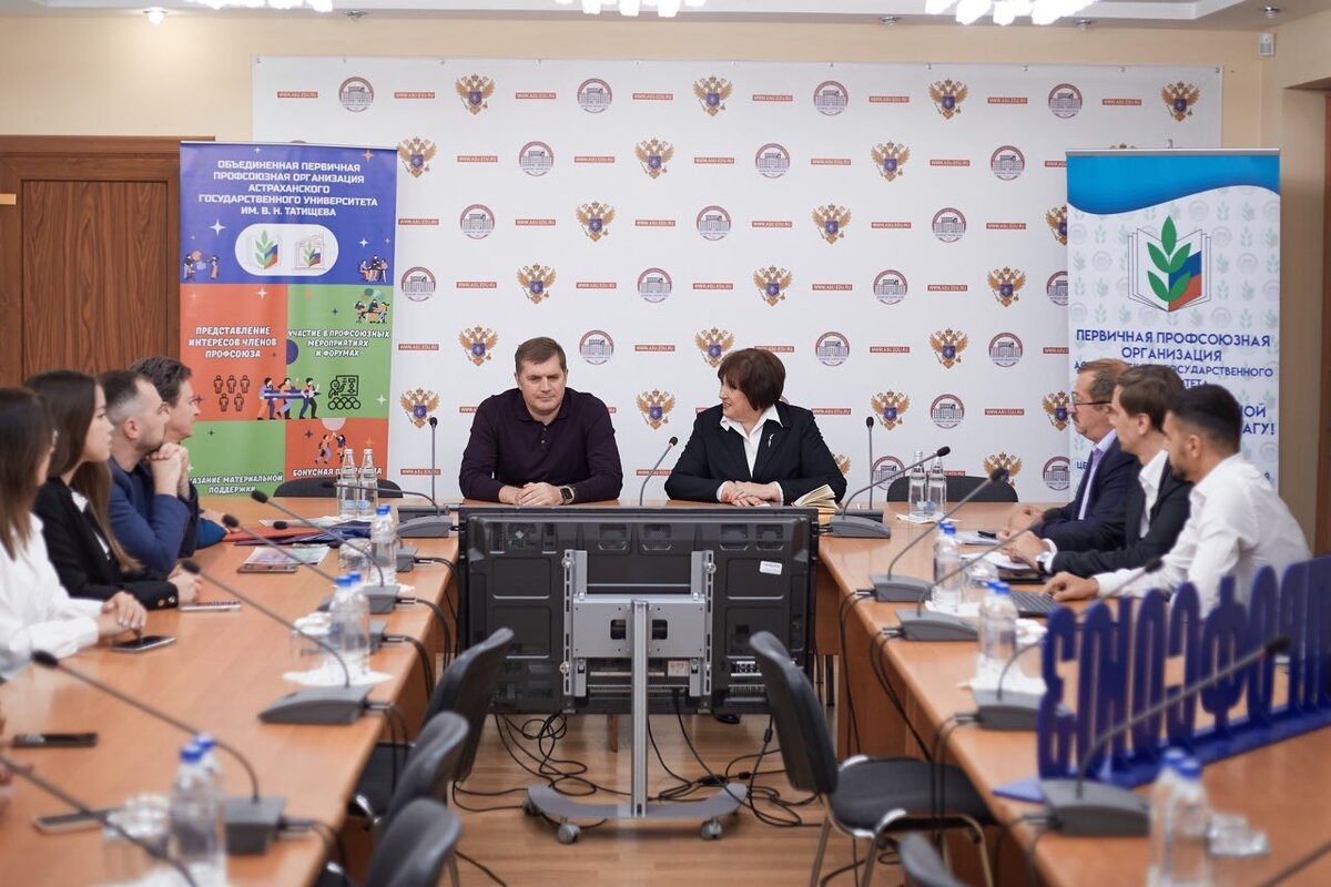 Исполняющий обязанности ректора познакомился с представителями первичной профсоюзной организации Астраханского государственного университета имени В. Н. Татищева. На встрече профсоюз Астраханского госуниверситета представили: председатель Объединённой первичной профсоюзной организации АГУ Людмила Касьянова, заместитель председателя Сергей Муравьёв, руководитель совета молодых педагогов Александр Рогов, а также студенческий актив АГУ. Участники обсуждали важные для университета в это непростое время вопросы, касающиеся заработной платы, стимулирующих выплат, скидок на обучение, условий труда сотрудников и других чрезвычайно важных вопросов. В ходе обсуждения исполняющему обязанности ректора представили основные направления деятельности профсоюзной организации. Также коллеги пришли к единому мнению о создании студенческого отряда, где ребята смогут в период летних каникул получить оплачиваемую социально полезную для области и университета работу. «Мы привлечём компании, которые будут заи