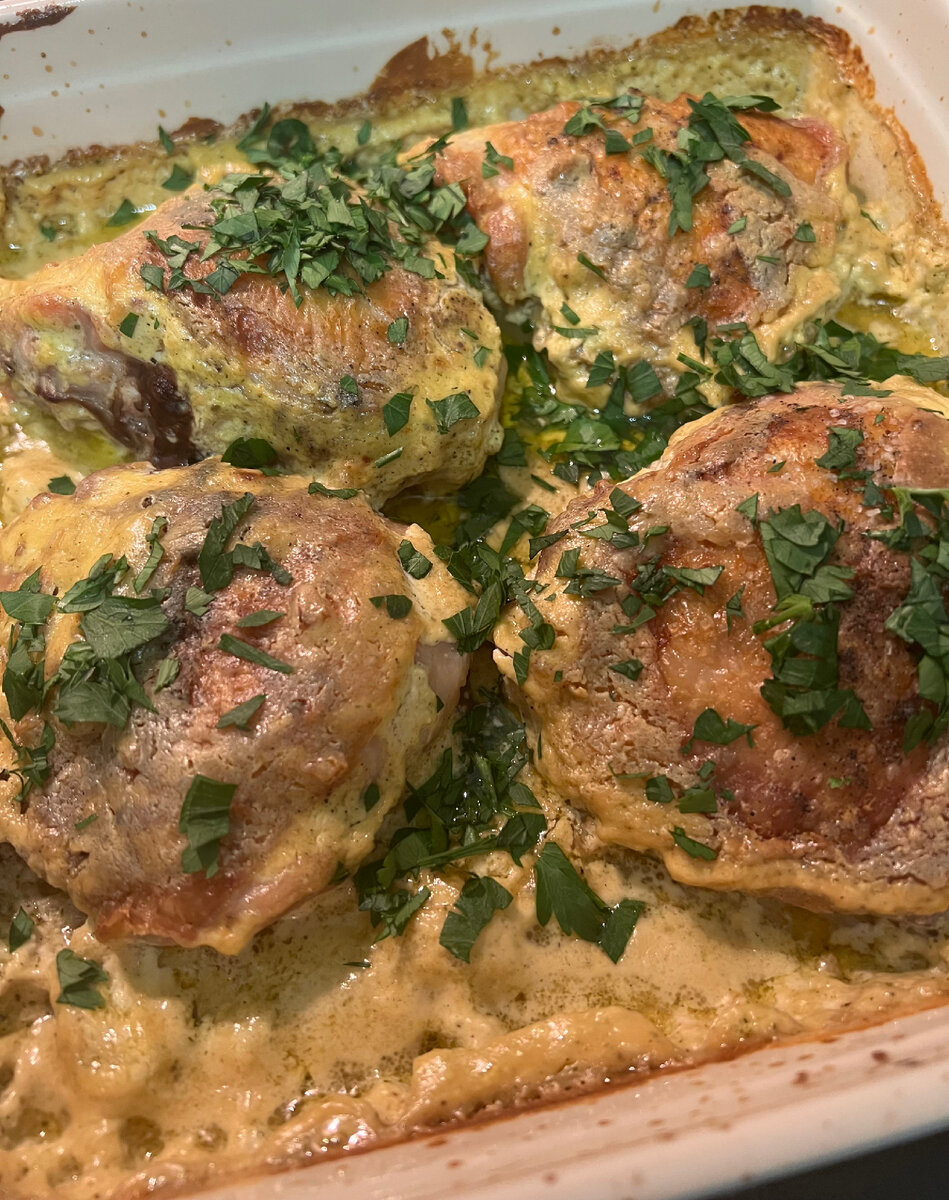 На с орошаем куске сливочного масла обжарить куриные бедрышки с обеих сторон до красивого золотистого цвета.