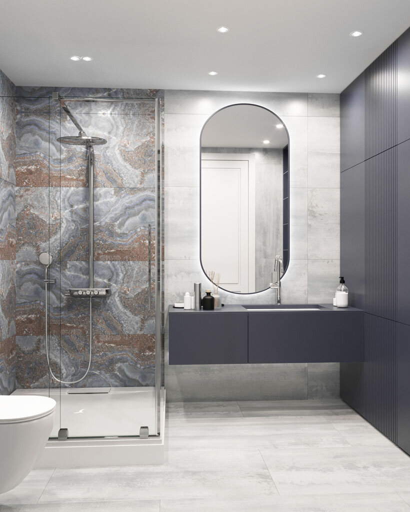- Отделка стены душевой под синий сланец, крупноформатным керамогранитом, размер плитки 60x120 см. Испанская фабрика Cifre, коллекция Jewel.