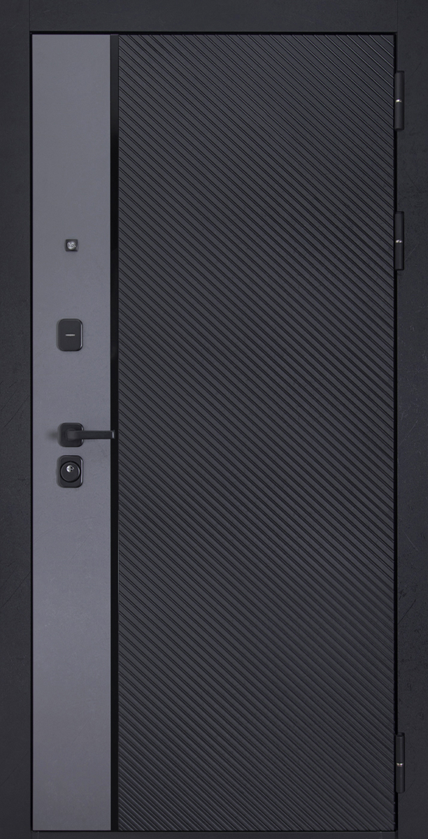 Петли: 3 петли с подшипником Внешняя отделка. Лист металла 1,5 мм. Экошпонированная панель МДФ 10 мм. Объемная фрезеровка. Цветовая комбинация "лофт черный" и "лофт графит". Декоративная пластиковая вставка (цвет “черный“). Наличник МДФ 80 мм. (цвет "лофт графит")