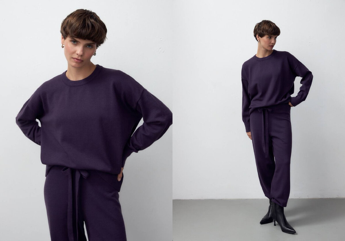 1 вариант. Монохромный костюм из вязаного трикотажа в баклажановом оттенке. Удобные брюки на эластичном поясе и мягкий, уютный джемпер можно стилизовать, как самостоятельный вариант. (а можно создать более классическую альтернативу с белой рубашкой)