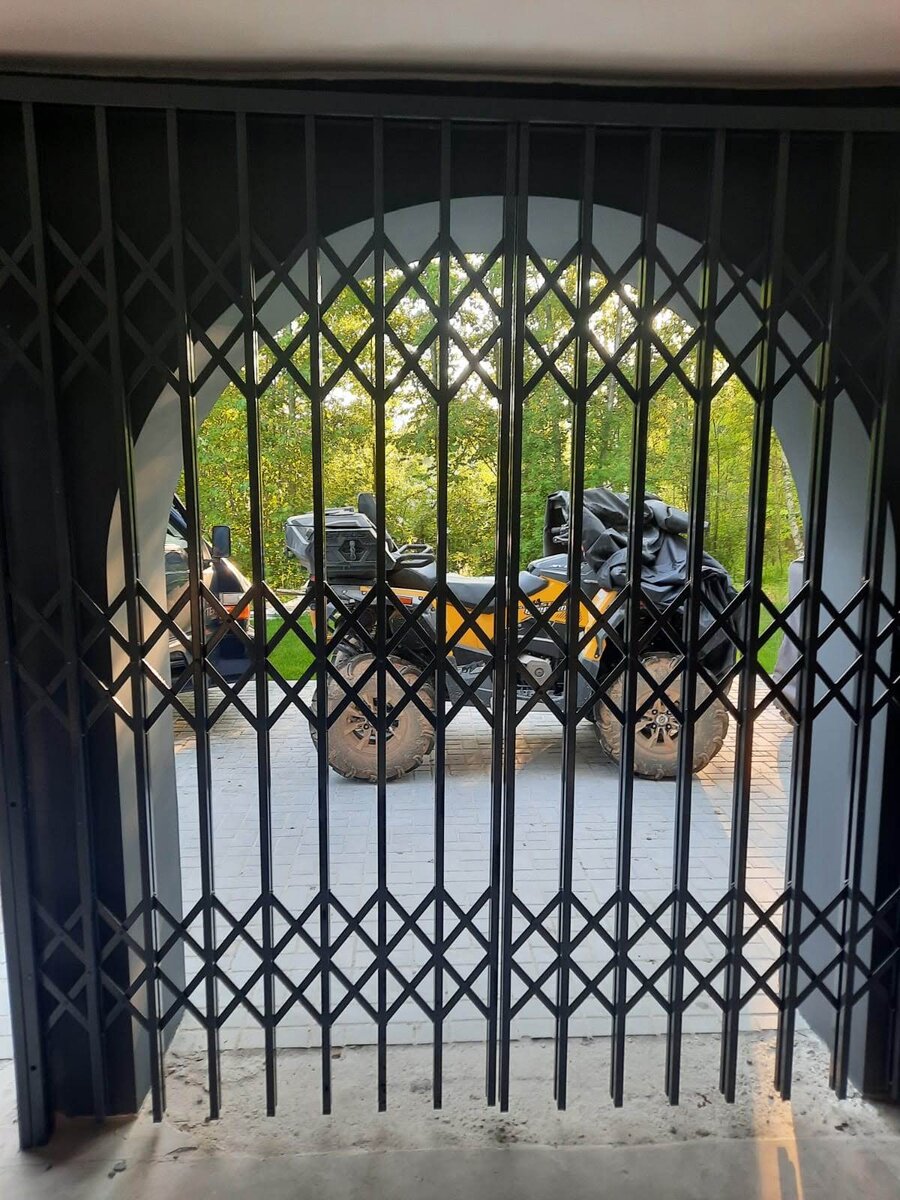 Защитная раздвижная решетка - ворота на парковочное место для квадроцикла У раздвижной решетки отсутствует нижняя направляющая, что значительно облегчает процесс уборки Решетка раздвигается в две стороны и уходит за световой проем. ATV идеально проходит между откосами. Есть место еще для нескольких квадроциклов Левая и правая часть раздвижной решетки складывается и поворачивается вдоль откосов.