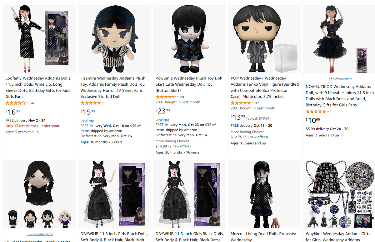 В Детском мире появились куколки по нашумевшему сериалу. В Америке тоже Венсдей (Уэнди, Венди, в общем, мрачная девочка семейки Аддамс) очень популярна, и куклы по сериалу заполонили Амазон: Куколка кажется интересной, но качество как у наших куколок по 50 рублей: Прошивка хуже, чем у Аврор из Фикспрайс: Но личико очень здорово передает характер : Интерено, что на этом наборе написано "Wednesday", хотя врядли права куплены официально. __________________________________________________________________________________________ Здесь уже отсылка к куклам- монстрам, и они "просто похожи" На Венсдей: __________________________________________________________________________________________ Жутковатая кукла (тоже подписана как Wednesday) От того же производителя есть Фестер и Ит: Как вам эти куколки? поселили бы кого- нибудь, если бы они были в наших магазинах по адекватным ценам?