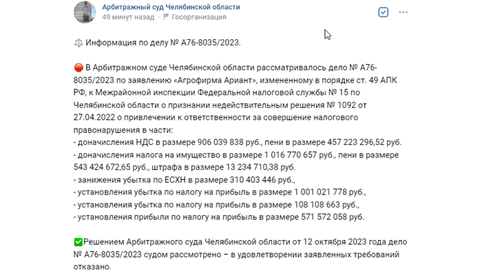 Арбитражный суд Челябинской области отказал ООО «Агрофирма Ариант» в удовлетворении заявления о признании недействительным решения налоговой инспекции о доначислении недоимки, пени и штрафа на общую сумму 2,94 млрд рублей, передает корреспондент Агентства новостей «Доступ». Речь идет о решении № 1092 от апреля 2022 года налоговой межрайонной инспекции ФНС № 15 по Челябинской области. По нему агрофирма привлечена к ответственности за совершение налогового правонарушения в части доначисления к уплате налога на добавленную стоимость (НДС) в размере более 906 млн рублей, пени по НДС – 457,2 млн рублей, налога на имущество в размере 1 млрд рублей, пени по налогу на имущество – 543,4 млн рублей, штрафа в сумме 13,2 млн рублей и других начислений. Сообщается, что агрофирма «Ариант» просила признать это решение недействительным. «Решением Арбитражного суда Челябинской области от 12 октября 2023 года дело № А76-8035/2023 судом рассмотрено – в удовлетворении заявленных требований отказано», – пр