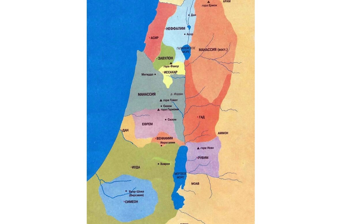 👉“И сказал Господь Моисею, говоря: дай повеление сынам Израилевым и скажи им: когда войдете в землю Ханаанскую, то вот земля, которая достанется вам в удел, земля Ханаанская с её границами: южная сторона будет у вас от пустыни Син… а границею западною будет у вас великое море… к северу же будет у вас граница: от великого моря проведите её к горе Ор, границу восточную проведите себе от Гацар-Енана к Шефаму..., и будут выступы её к Соленому морю. Это будет земля ваша по границам её со всех сторон” (Чис. 34:1-7). Плюс к этому - земли к востоку от Иордана для двух с половиной колен Израилевых.