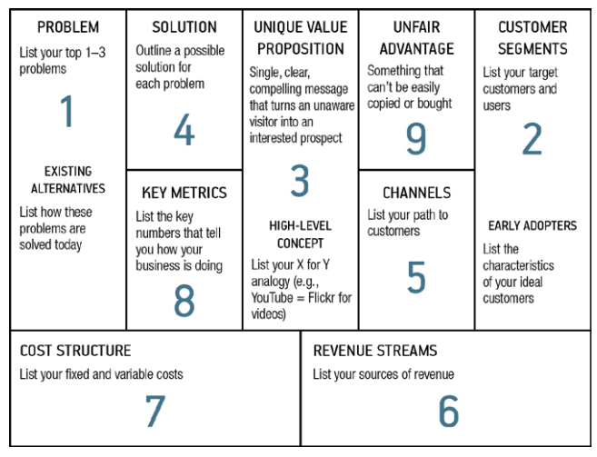Lean Canvas - это одностраничный визуальный бизнес-план, который является постоянным и выполнимым. Он был создан Эшем Маурьей и вдохновлен бизнес-моделью Canvas Алекса Остервальдера. Как вы можете видеть на рисунке ниже, он состоит из девяти блоков, организованных на одном листе бумаги, предназначенных для ознакомления с наиболее важными аспектами любого бизнеса.