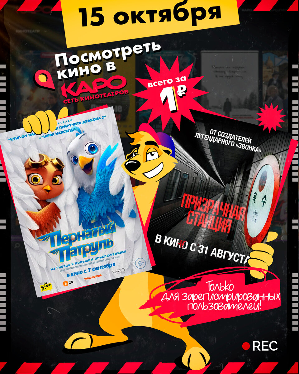 Акция в кинотеатрах КАРО Во всей сети кинотеатров КАРО 1 и 15 числа каждого месяца фильмы с меткой "кино и точка" показывают за 1₽. В этот раз можно будет посмотреть южнокорейский ужастик "Призрачная станция" и китайский мультик "Пернатый патруль". В Каро есть супер удобные залы с роботизированными креслами, беспроводной зарядкой и столиками. Они находятся в кинотеатрах: – Марс – София – Нева – Будапешт – Рассвет – Высота Важно❗️ Акция доступна только для зарегистрированных пользователей. На новых аккаунтах покупка за рубль станет доступна примерно через сутки. 🎟Билеты (нужно выбрать 15 октября и акцию "Кино и точка", цена изменится на 1₽ при выборе места) Подписывайся на канал "Пошли, пройдёмся" в Telegram, чтобы быть в курсе самых интересных мероприятий и локаций Москвы