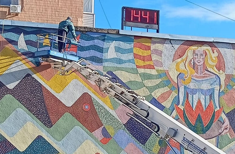 Сегодня, 12 октября, в Камышине бригада рабочих приступила к восстановлению популярного для фотосессий мозаичного панно «Девушка с арбузом». Оно расположено на торцевой стороне 14-этажного жилого дома на углу улиц Октябрьской и Пролетарской. Высотка известна как «сахалинец» по адресу подрядчика, который построил этот самый многоэтажный дом в городе во времена СССР в 1980 году (панно размещено на стене пристройки, где размещается аптека).