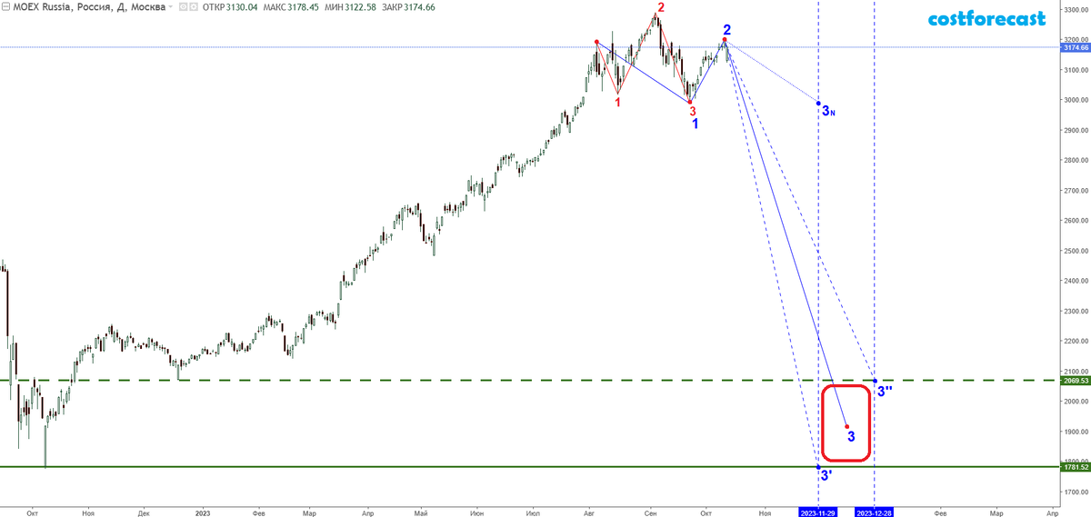 Анализ фрактальной структуры графика индекса ММВБ показывает, что в краткосрочном периоде времени наиболее вероятной будущая динамика значений индекса будет нисходящей в рамках формирования 3-го сегмента фрактала, обозначенного на графике синим цветом. Завершение синего фрактала стоит ожидать на временном интервале (29.11.2023; 28.12.2023) в диапазоне значений (1781,52; 2069,53).