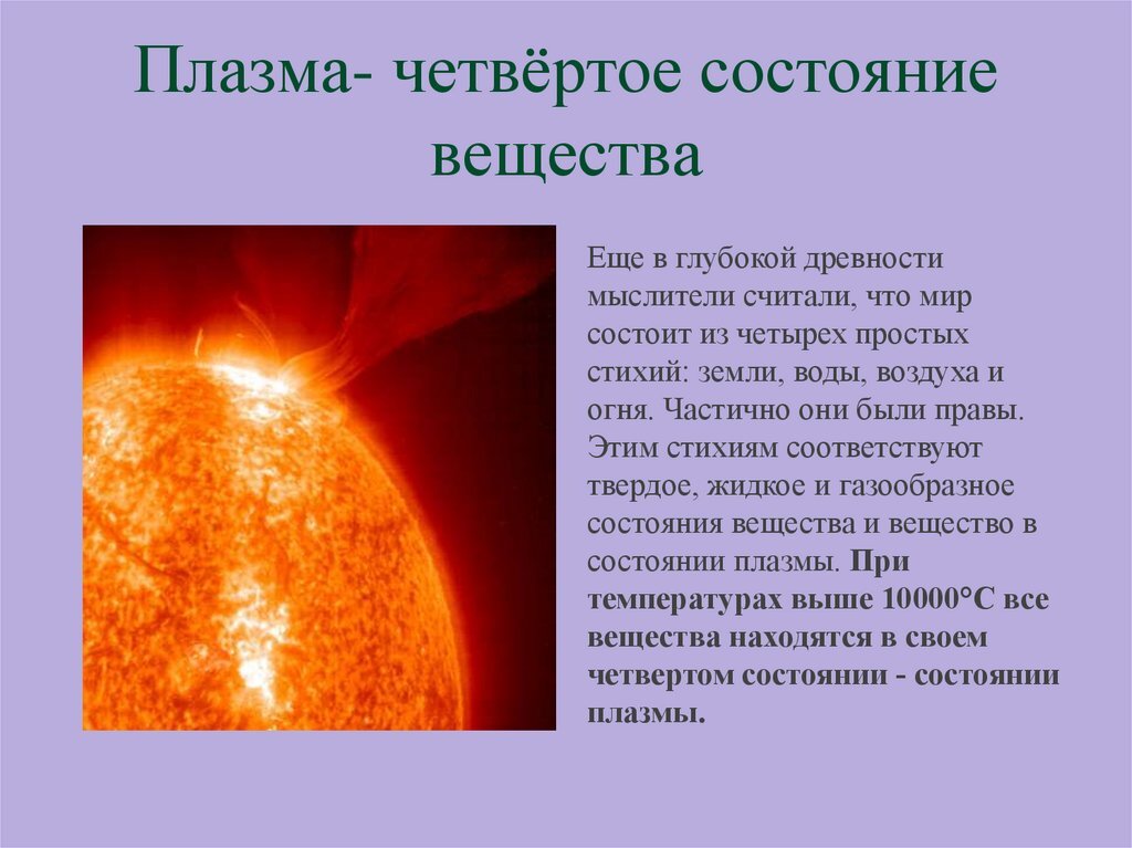 - Ещё крупнейший древнегреческий учёный Аристотель предполагал, что все тела состоят из четырёх низших элементов-стихий: земли, воды, воздуха и огня. Дальнейшее развитие науки наполнило новым содержанием эти термины. Действительно вещество может быть в четырёх состояниях: твёрдом, жидком, газообразном и плазменном.