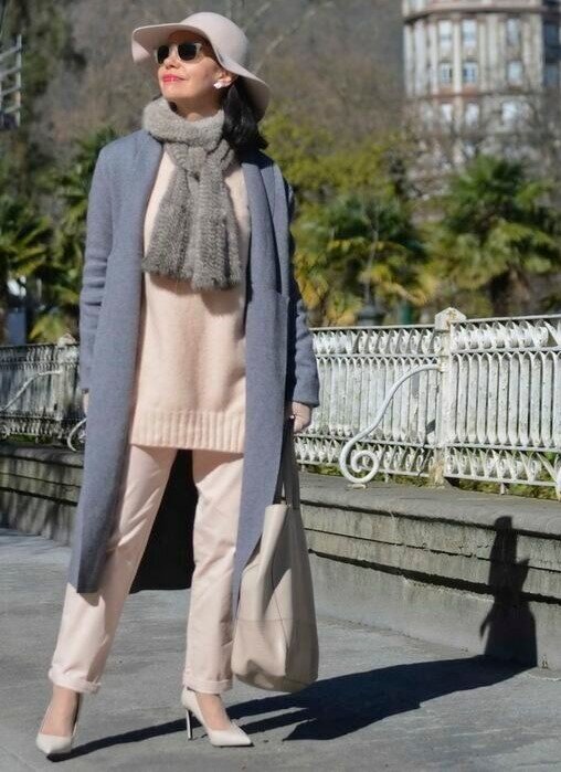 - Пудровый и сизый. Пудровый цвет отлично освежает, поэтому стоит включить его в свой гардероб. В примере – комплект из прямых узких брюк и свободного свитера, обе эти вещи пудрового цвета. К этому добавили прямое пальто сизого цвета и серый шарф. Образ дополняют нюдовые туфли и широкополую шляпу оттенка «пыльная роза».