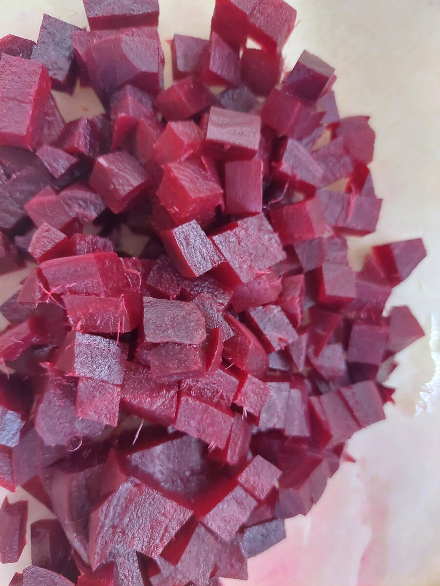 5 средних картофелин 3 средних свёклы 3 средних моркови 1 крупная луковица 3 солёных (или маринованных) огурца Растительное масло или Майонез Картофель, свёклу и морковь промыть и сварить до готовности, затем нарезать кубиками. Лук и огурцы также нарезать кубиками. Все смешать и заправить растительным маслом или майонезом. Приятного аппетита!