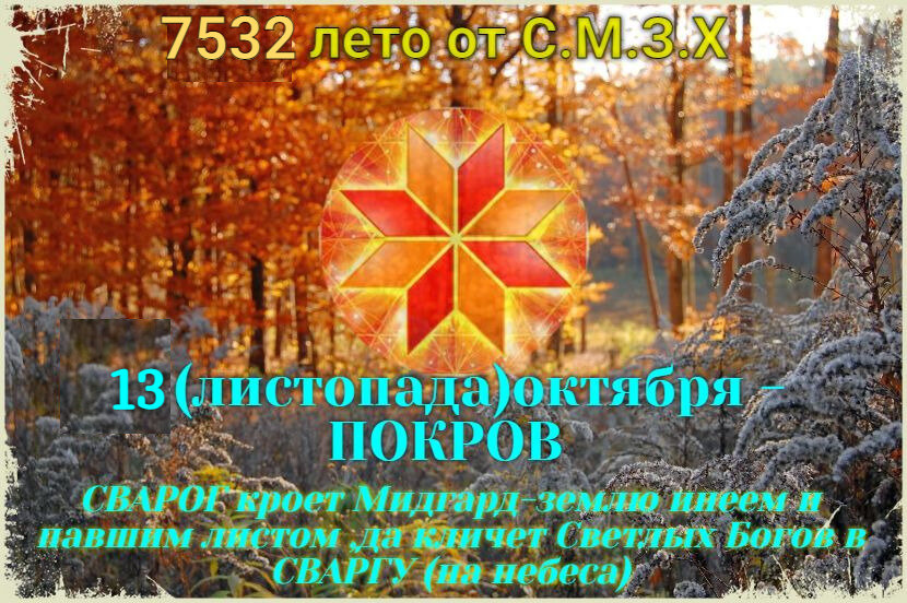 ПОКРОВ-СЛАВЯНСКИЙ природный ПРАЗДНИК… нынче, на 7532 лето от СМ.З.Х. (2023г от р.х.) приходится на 13 октября !!!!(середина октября в Пятницу) Коль РУСИЧ ты - ЖИВИ В ЛАДУ С ПРИРОДОЙ!! Чти своих Богов,а не пришлых, и КОНЫ своих предков!! Слава РОДУ!!! Все наши праздники приурочены к природным явлениям....НИКАКОГО отношения к СЛАВЯНСКИМ праздникам ПРИРОДЫ не имеет иудейское христоЕДство!!! Покров - древний славянский праздник встречи Осени с Зимой, означавший конец осенних хороводов, начало зимних посиделок,да усердных работ прях и ткачи(покровительница - Макошь-Пятница) Считалось, что Сварог покрывает Землю павшим листом да кличет Светлых Богов на Небеса (в Сваргу)- (отмечается в СЕРЕДИНЕ ОКТЯБРЯ - в ПЯТНИЦУ!!! По народным приметам в этот день можно узнать, когда наступит зима. Например, наши предки считали, что если на Покров выпал снег, то сильные морозы наступят через 40 дней. А если идет дождь и дует холодный ветер, то зима наступит намного раньше и будет холодной и снежной. Сильный