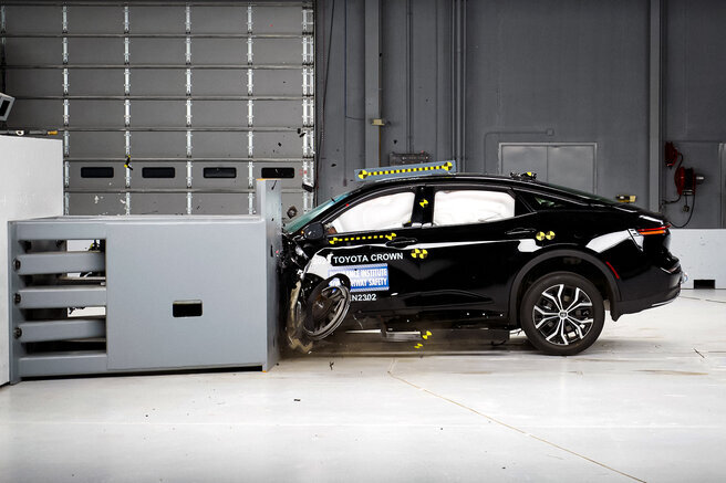 Испытания на безопасность Toyota Crown 2023 проводил Американский институт дорожной безопасности (IIHS). Модель получила высшую оценку Top Safety Pick+, набрав максимальное количество баллов во всех категориях, включая лобовое столкновение с небольшим перекрытием и боковой удар. Единственным замечанием специалистов IIHS стали фары, которые были оценены как "приемлемые". В краш-тестах участвовала версия Crown 16-го поколения, представленная прошлым летом в четырех вариантах: обычный седан, "вседорожный" седан, поднятый хэтчбек и кроссовер. IIHS выбрал для испытаний поднятый седан с полным приводом, базовой комплектацией и системой безопасности Toyota Safety Sense 3.0, которая также была признана эффективной как днем, так и ночью. Что касается оптики, единственные замечания относятся к светодиодным фарам Bi-LED, установленным в начальной комплектации. В более дорогих версиях автомобиля используются фары Quad-LED, которые не вызвали никаких нареканий. В США Toyota Crown доступен с д