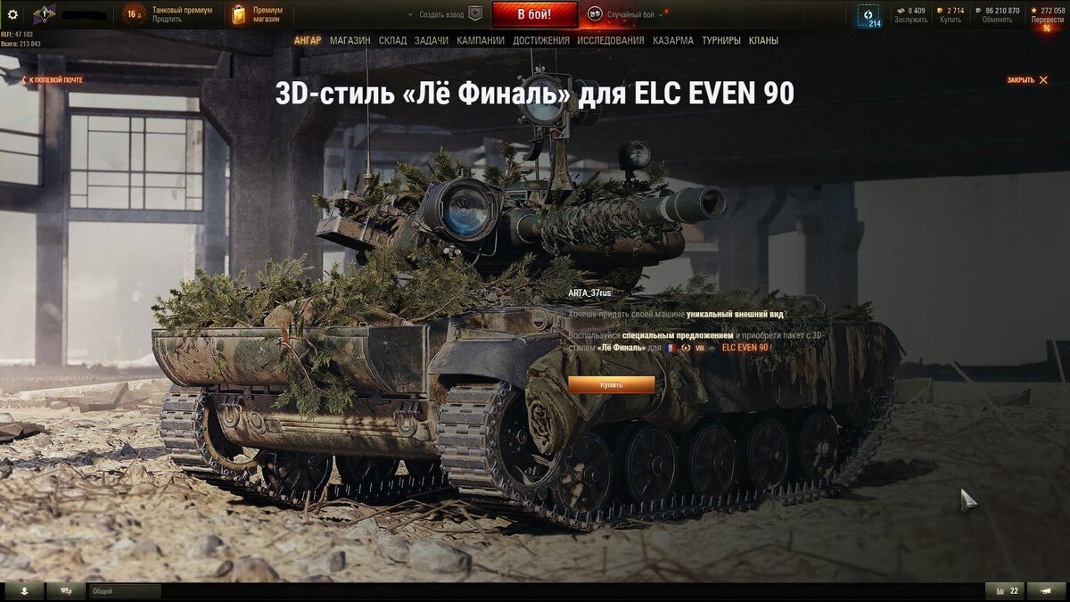 С момента своего появления, 3D-камуфляжи стали настоящим хитом среди игроков Мира танков. Они придают танку уникальный и стильный вид, но и значительно улучшают его характеристики. Введение 3D-камуфляжей в игру значительно оживило геймплей. Таким образом игроки получили разнообразные и стильные танки, которые не только выглядят красиво, но и имеют улучшенные характеристики. Индивидуальное предложение, историчный 3D-стиль «Лё Финаль»: Для того, чтобы получить этот стиль нужно сыграть один бой на танке ELC EVEN 90. После вы получите предложение купить историчный 3D-стиль «Лё Финаль» на Полевую почту. Также можно самостоятельно зайти в Магазин —> Лучшее (2 раздел) —> подраздел «Другие предложения» —> пакет за: 4 000 золота 3D-стиль «Лё Финаль». Предложение индивидуальное и может приходить с задержкой. В целом, 3D камуфляжи значительно улучшают геймплей в Мире Танков. Они делает игру более интересной и разнообразной, позволяя игрокам создавать уникальные и красивые танки с улучшенными ха