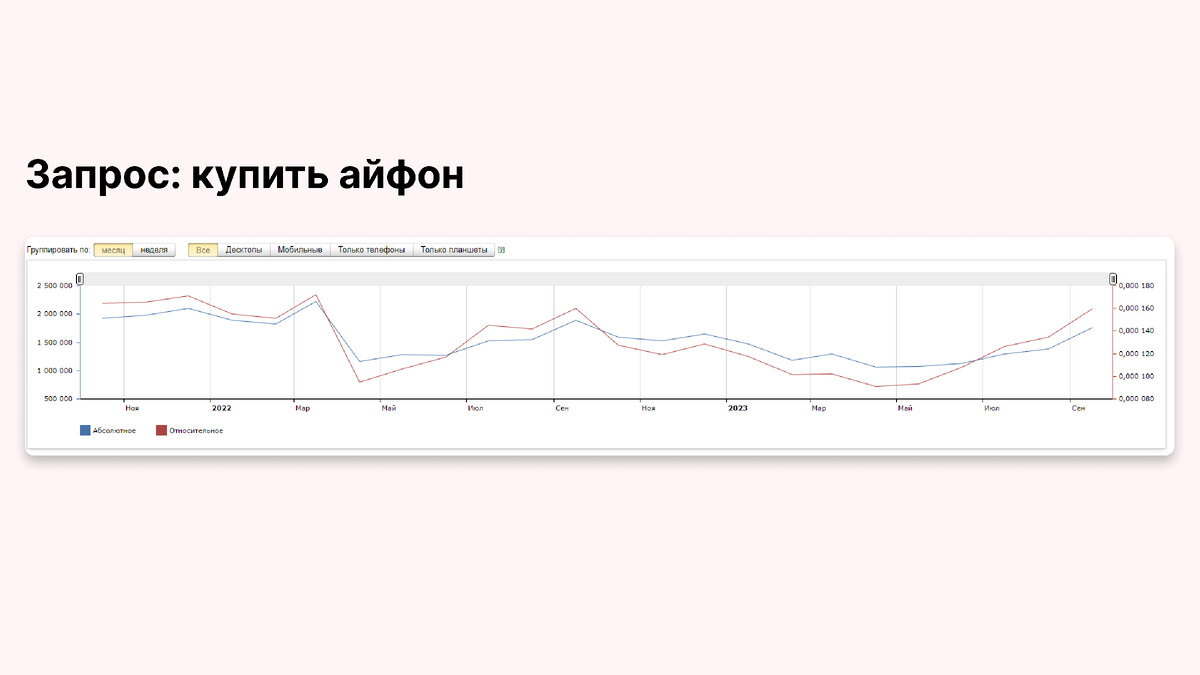 Развитие интернета позволяет накапливать цифровые данные и в дальнейшем использовать их для статистических отчётов. Хочу рассказать как можно с помощью сервиса Яндекс Вордстат оценить спрос на любой товар в интернете. Для этого в поиске Яндекса или Гугла наберите Яндекс Вордстат и перейдите в сервис. Ссылку прикладываю. Для этого введите название товара в поисковой строке сервиса. На выходе вы получите варианты поисковых запросов, как ищут данный товар ещё и количество запросов, сколько люди в месяц запрашивают в поисковике эти запросы. Но вас интересует в первую очередь динамика по спросу в разрезе недель или месяцев. Поэтому выберете кружок в пункте «История запросов» и на выходе получите график с изменением количества запросов, что говорит о динамике спроса. А больше полезных материалов можно найти в моём блоге. В нём я регулярно делюсь бесплатными шаблонами и инструкциями, которые существенно облегчают жизнь маркетолога.