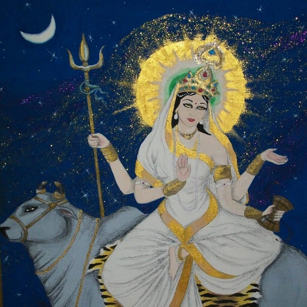 Одетая в белоснежное сари, с бриллиантовыми украшениями, изящно восседающая на белом быке, Она ослепляет блеском тысячи солнц. Будучи Чатурбхуджи - четырехрукой, она держит в двух руках трезубец и барабанчик Дамару. Две ее другие руки показывают благословляющие мудры Абхая и Варада.