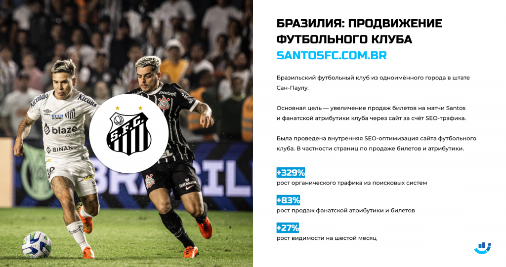 Продвижение сайта — ключевая составляющая успеха для футбольного клуба в наши дни. По статистике, футбольные клубы Бразилии имеют огромную базу фанатов, и готовы следовать за своими командами в виртуальном мире так же, как и в реальной жизни. В этом кейсе мы рассмотрим, как успешно продвигался один из бразильских футбольных клубов в онлайне, используя современные методы и технологии. Клиент Santosfc — бразильский футбольный клуб из одноимённого города в штате Сан-Паулу. Задача Увеличить продажи билетов на матчи Santos и фанатскую атрибутику клуба через сайт на 100% за счёт SEO-трафика. Решение Провести внутреннюю SEO-оптимизацию сайта футбольного клуба. В частности страниц по продаже билетов и фанатской атрибутики: santosstore.com.br и santosfc.com.br/ingressos. Продвижение сайта Результаты Хотите так же? Обратитесь к нам, и мы подключим проектную команду уже сегодня. Советы от вице-президента футбольного клуба: Продвижение футбольного клуба VKontakte. Кейс реклама чемпионата FIFA: По