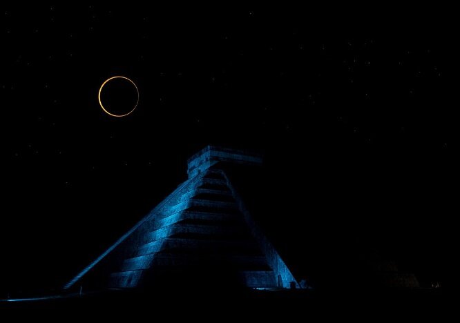 14 октября 2023 года произойдет небесное событие: Солнце, Луна и Земля соединятся в кольцевое солнечное затмение. Кольцевое солнечное затмение происходит, когда Луна движется между Солнцем и Землей, но находится в самой удаленной от нашей планеты точке. Из-за большого расстояния Луна кажется сравнительно меньшей, чем Солнце, и лишь частично закрывает его. Поэтому наблюдатели видят Луну в виде темного диска, противопоставленного более крупному светящемуся диску Солнца, что создает поразительную визуальную иллюзию кольца, опоясывающего Луну. На языке науа это описывалось как Tonatiuh qualo , «Солнце съедено», а на языке майя - Pa'al K'in , «разбитое солнце». Майя разработали исключительно точную форму астрономии до телескопа, используя полностью развитую письменность и свою собственную позиционную систему счисления. Эти достижения были полностью присущи Мезоамерике, что ставит их на первое место в области астрономических представлений. Астрономия майя основывалась на наблюдениях невооруж