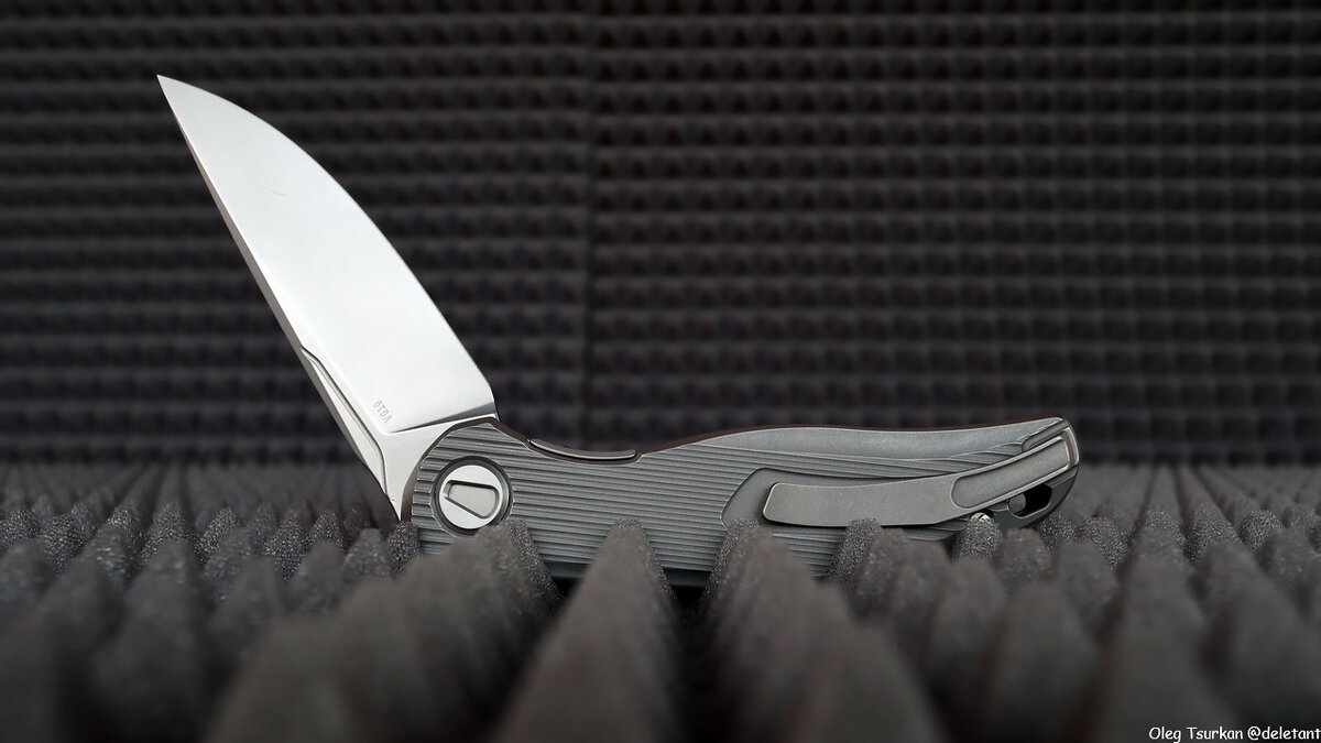 Лезвие имеет мягкое матовое сатинирование, которое сочетается с титановыми плашками рукояти.