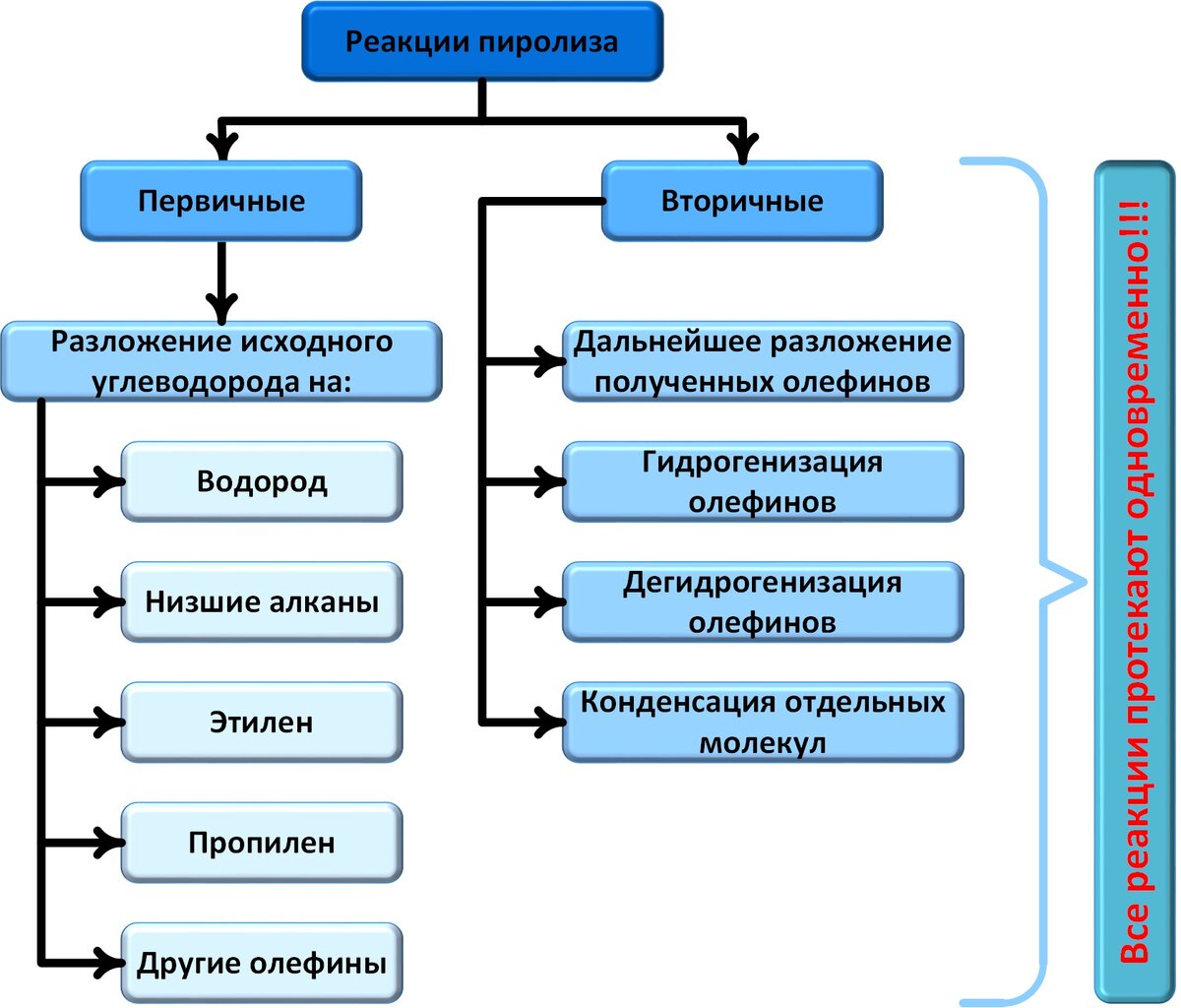 Все реакции пиролиза можно разделить на первичные и вторичные: